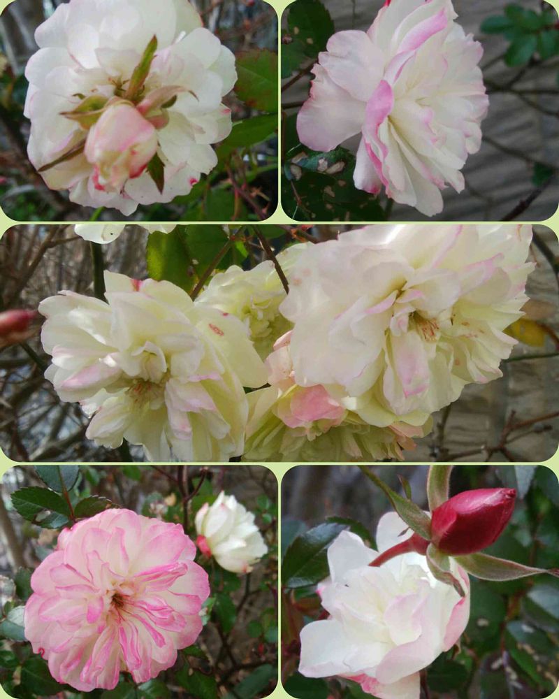 同じ木から白からピンクへ色々な表情で咲いています。