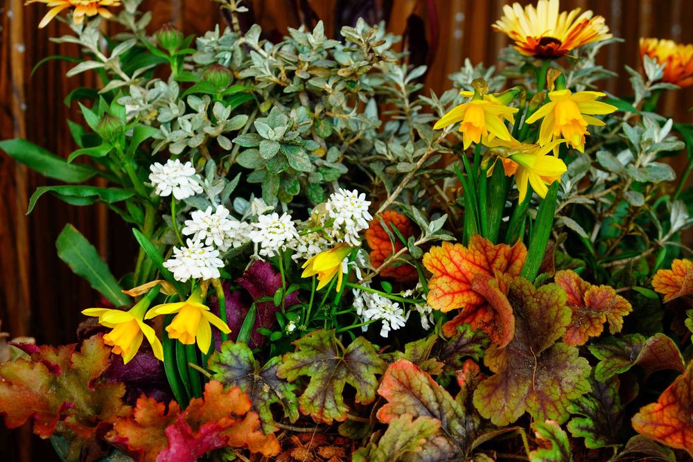 年明けに作った寄せ植えが馴染んで来た頃、暖かさに誘われてスイセン テタテートがぽんぽんぽんと咲き揃う。
