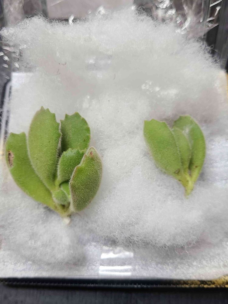 1回目のが来たら、熊童子とプレゼントのハオルチア、その熊童子がモフモフの毛が生えてない変な植物、葉っぱの形はカランコエ胡蝶の舞の様