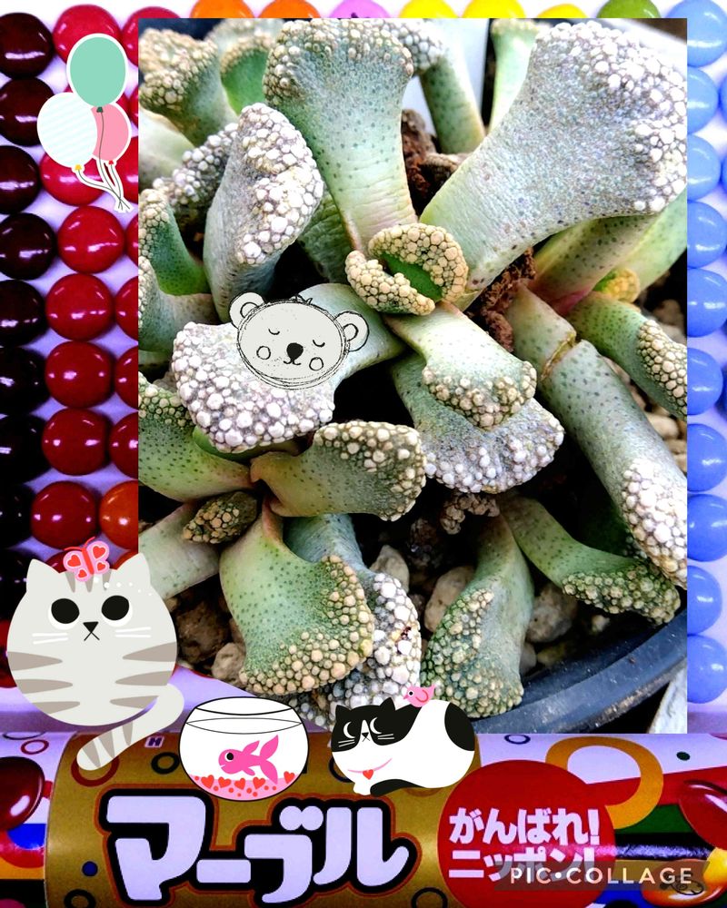 葉先に砂粒のような突起が付いてユニークです🥳秋から冬に黄色か白い花を咲かせますこちら☝️2代目でまだお花見た事