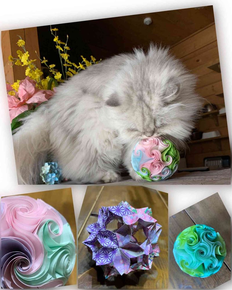 桜玉🌸最初はピンク色の紙のユニットを購入して作りましたが色合いが単純、それにお高い💴…という事で自分で折り紙を切り出して色合いや柄を考え組み合わせました。 そんな面倒な事よくやるね!っとよく言われますが価値観の違いでしょうか?