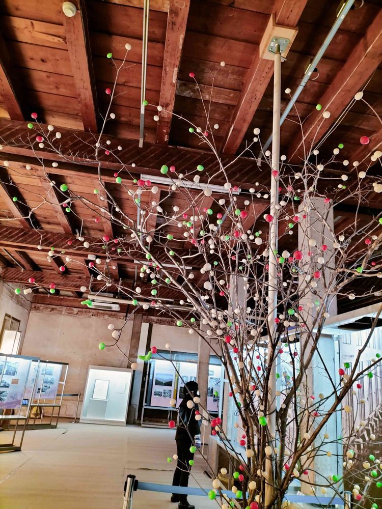 このまゆ玉飾りは甘楽富岡地域の養蚕農家の団体である甘楽富岡蚕桑研究会の皆さんによるものでヤマボウシの枝を使用しています。