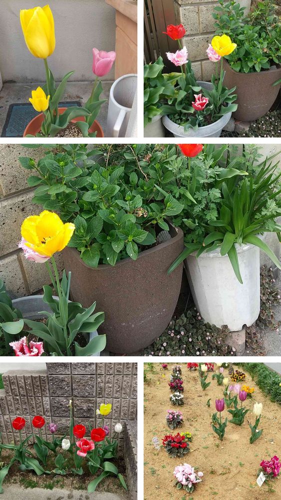 家の玄関、広い庭のチューリップのコラージュが綺麗です🌷