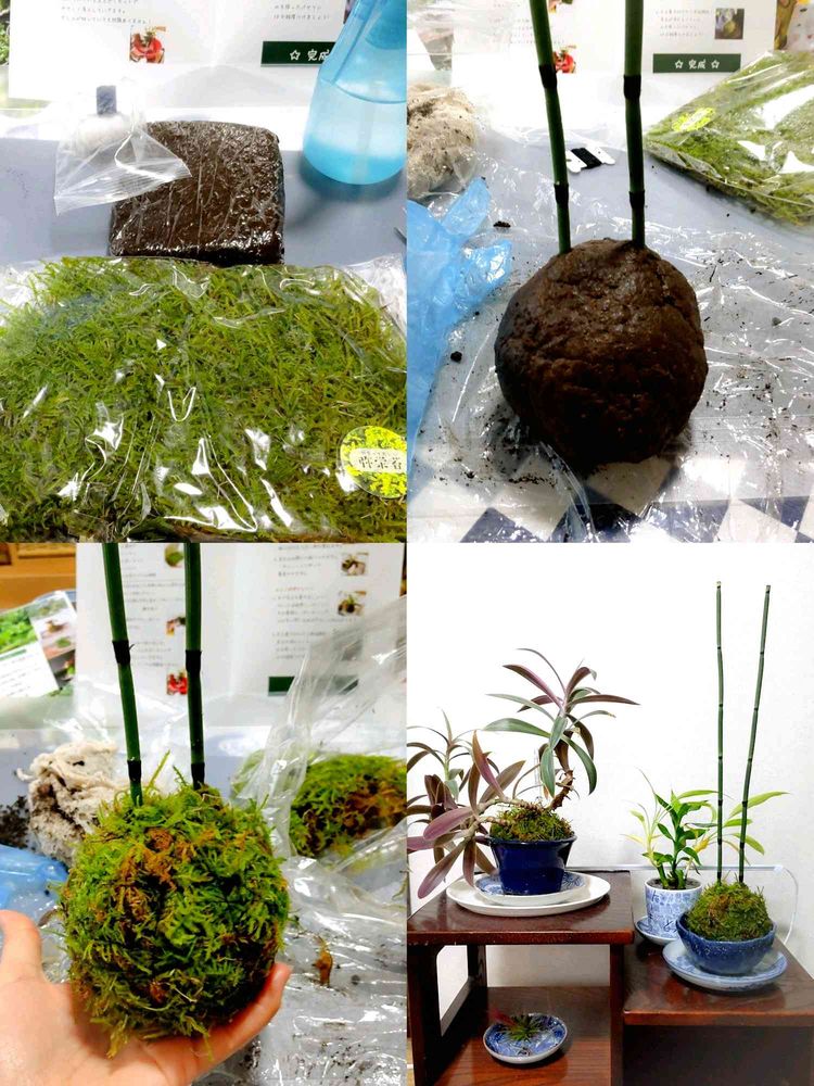 こけ玉キットを購入して、実家の庭から持ち帰ったトクサをこけ玉にしてみました、苔の茶色部分が出てしまい見栄えがいまいち…シュールな物が出来上がりました。