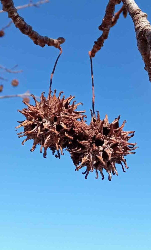 フウ科フウ属の落葉高木。大正時代に渡来した。北米原産のためアメリカフウともいう。枝に翼(よく)と呼ばれる突起がつく珍しい特徴があるが、翼がつかない個体もある。葉は大型で5つに裂ける。カエデの葉に似るが、カエデ類は葉が対生するのに対し、本種は互生する。紅葉は赤系で暖地や街中でも色づきがよいので、街路樹や公園によく植えられる。花期は4月。葉の展開と同時に咲く。雄花は上向き、雌花は球状で下向きに咲く。果実は蒴果が多数集まったイガグリ状の集合果で、秋に熟し落葉後も枝についている。結実すると全面に穴が開き、多くの翼果が四方八方に飛び出す。さらに、果柄は樹木側が曲がっていて、風にうまく揺らされる構造になっている。種を飛ばし終わって空っぽになったフウボックリが金や銀に着色されてクリスマスや年末に花材として出回る。