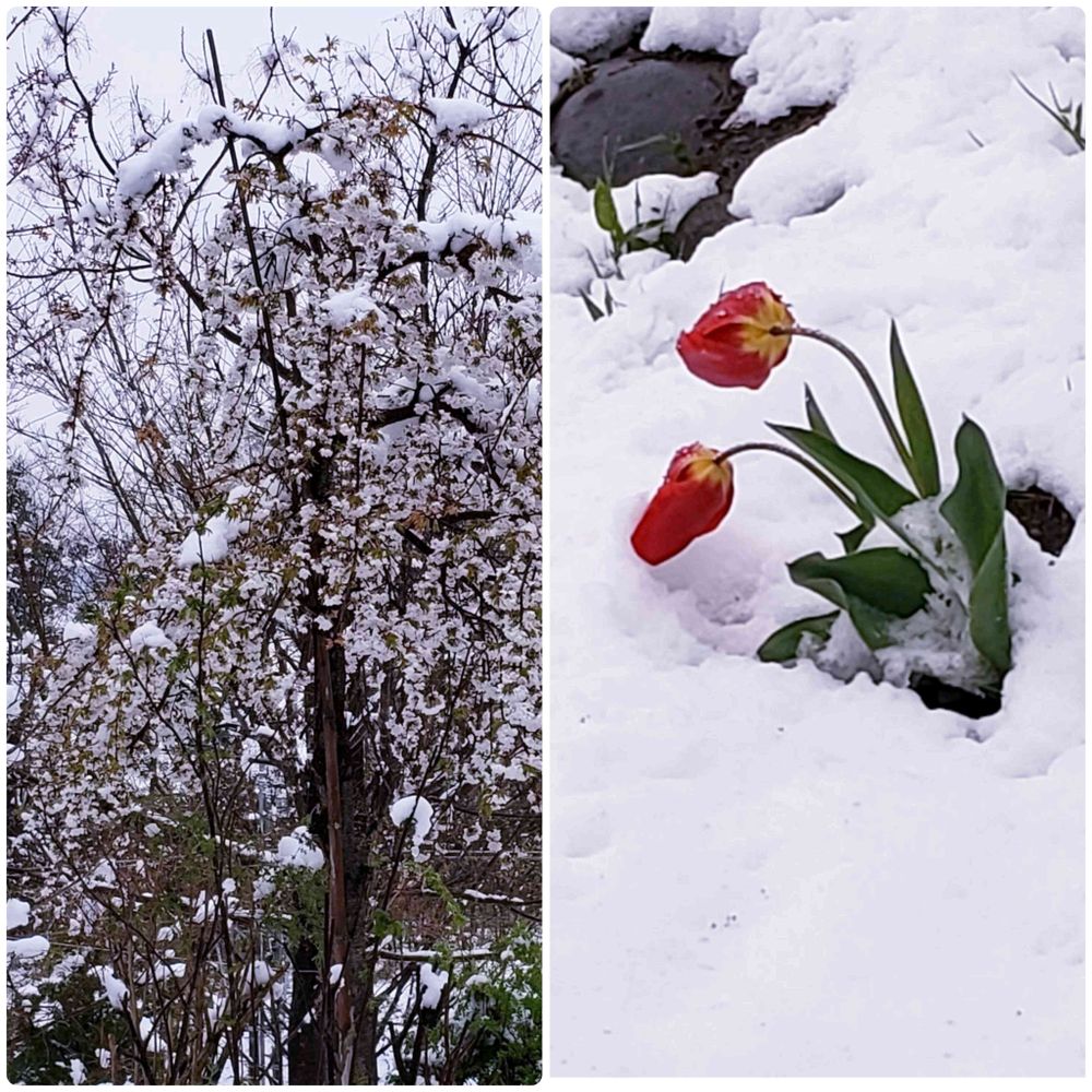 同じ時期に咲いていた枝垂れ桜にもこの赤いチューリップにも春の雪が降り積もりました