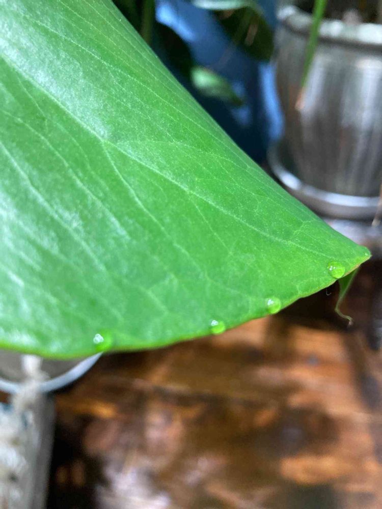 室内のモンステラの葉に水滴がいつも出て来ますよ。