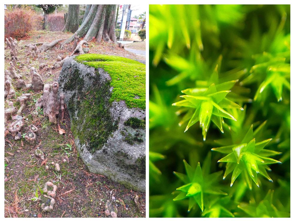 気根のそばにある石の上に、きれいな緑のコケを見つけました。名前はわかりませんが、100均マクロレンズで撮りました。