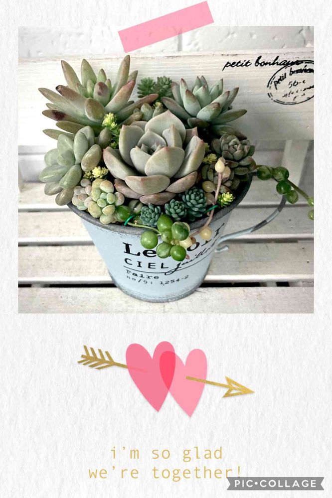 これは、カップ鉢をまず仕入れたのですが、販売用に買ったブルーブリトーがあったこと、家にあった樹氷が鉢からはみ出して大きくなってたので使いたかった、ということから、どっちもブルー系だからそれでまとめちゃおう!という感じで、あとは家にある多肉を合わせて作りました。