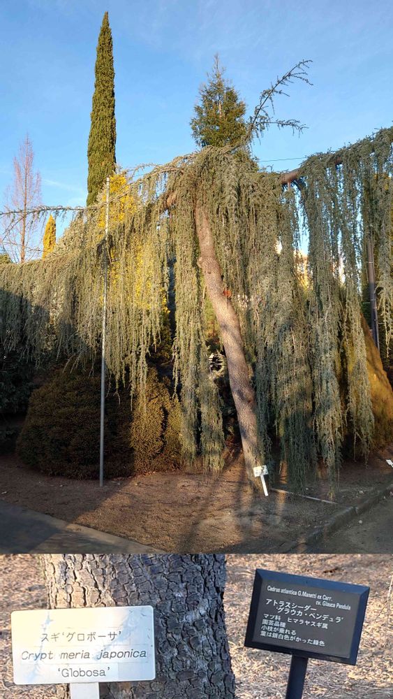 緑のカーテンの正体が正式にわかりました🧐 行方不明の名札が立っていました🙌 レンズ先生の言うとおり「アトラスシーダー」、おいちゃさんの言うとおり「ヒマラヤスギ科」です👏 たぶん、「ここにいつも来るヤツがいるから、名札探して立てておくかぁ」と職員さんがやってくれたんだと思います😀🙇 よかった、よかった👏👏👏