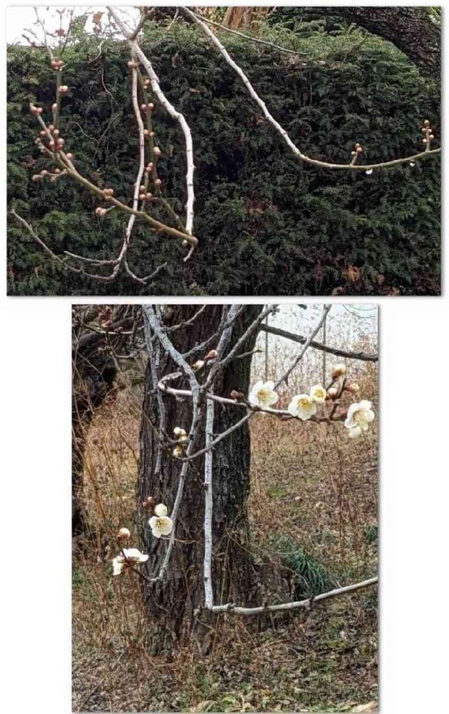 下は昨日斜面のお隣りの梅林の梅… 一部だけ開花していました