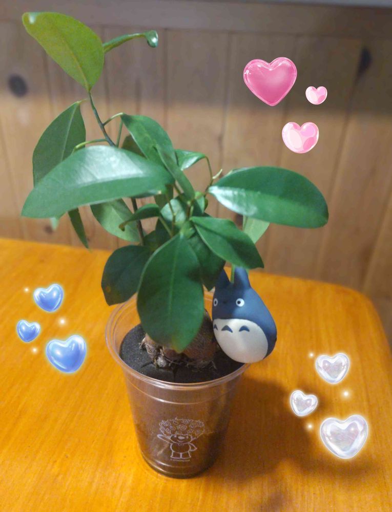 テーブルプランツのガジュマル君にトトロが寄り添ってます🥰