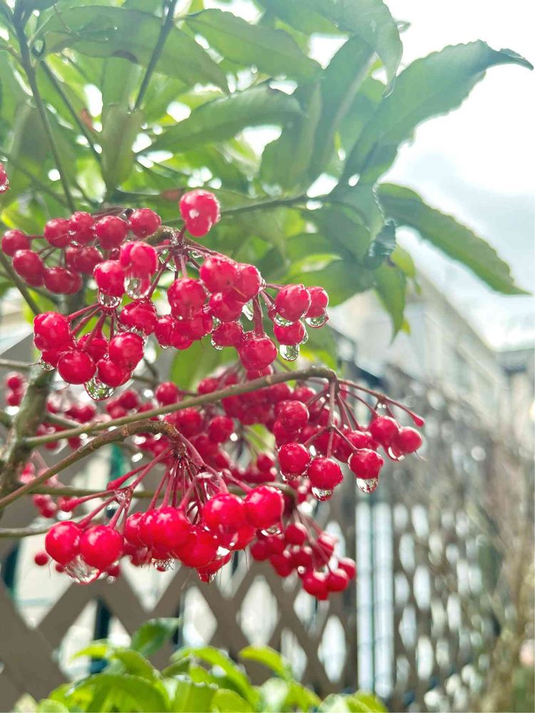 冷たい雨の中、真っ赤に色づいた小さな実♪