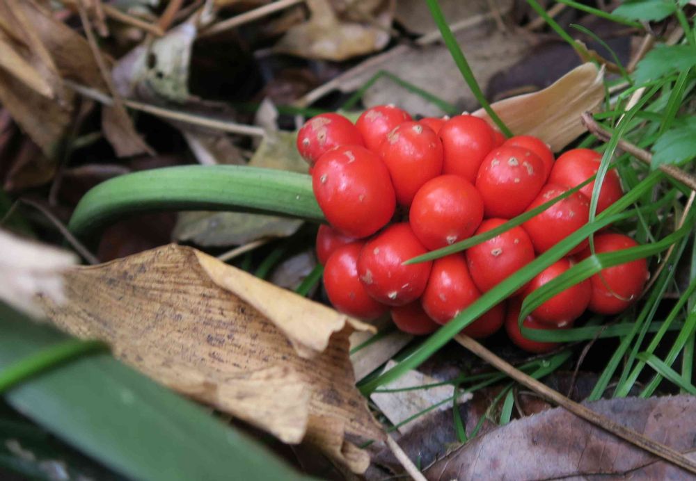 冬の中休み、庭の雪が解け枯れ葉を整理したら、落ち葉の下から真っ赤なオモトの実が🎶😄