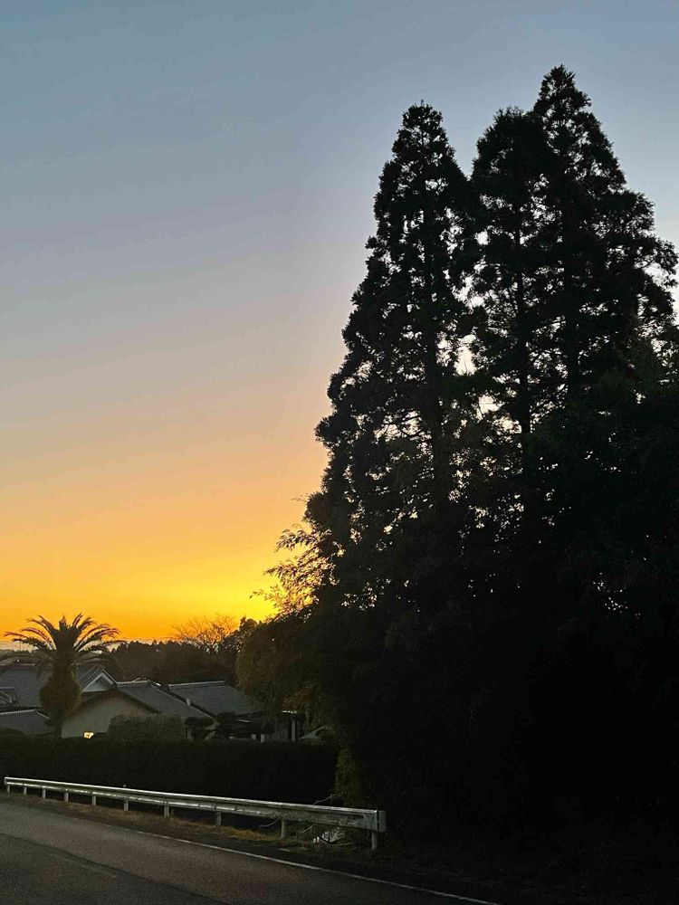 この風景は、いつもの散歩で目にするもので、撮影のスポットの一つの風景で、二本杉:夫婦杉と従兄弟の庭に聳え立つ一本のフェニックス の位置から観える、東方に朝陽が昇リ始めやお月さまが昇って来ると撮影のポイントになっていますデス🐶