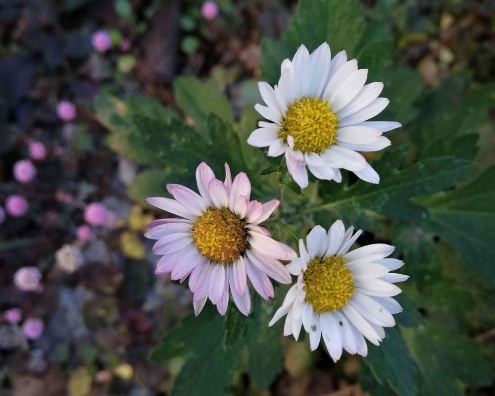 うちの庭に咲いているキクの花は,開き始めは白でも,開ききった後は遅かれ早かれ,例外なく薄紫に染まっていくことが分かりました。