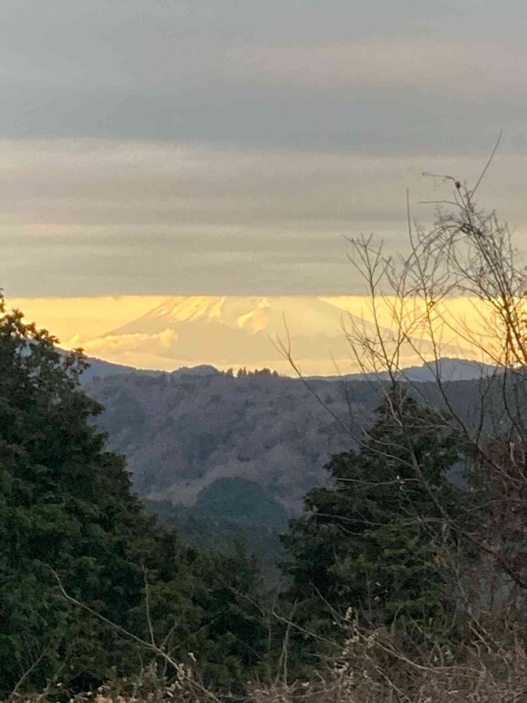 重い緞帳のような雲が空全体に広がり、隙間からほんのり金色の夕陽の御山が見えました