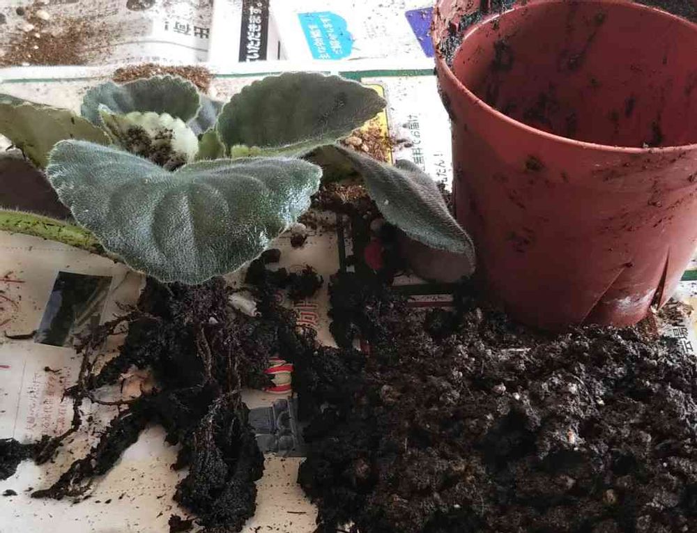 もう1鉢のセントポーリアの根は、短くて黒かった。