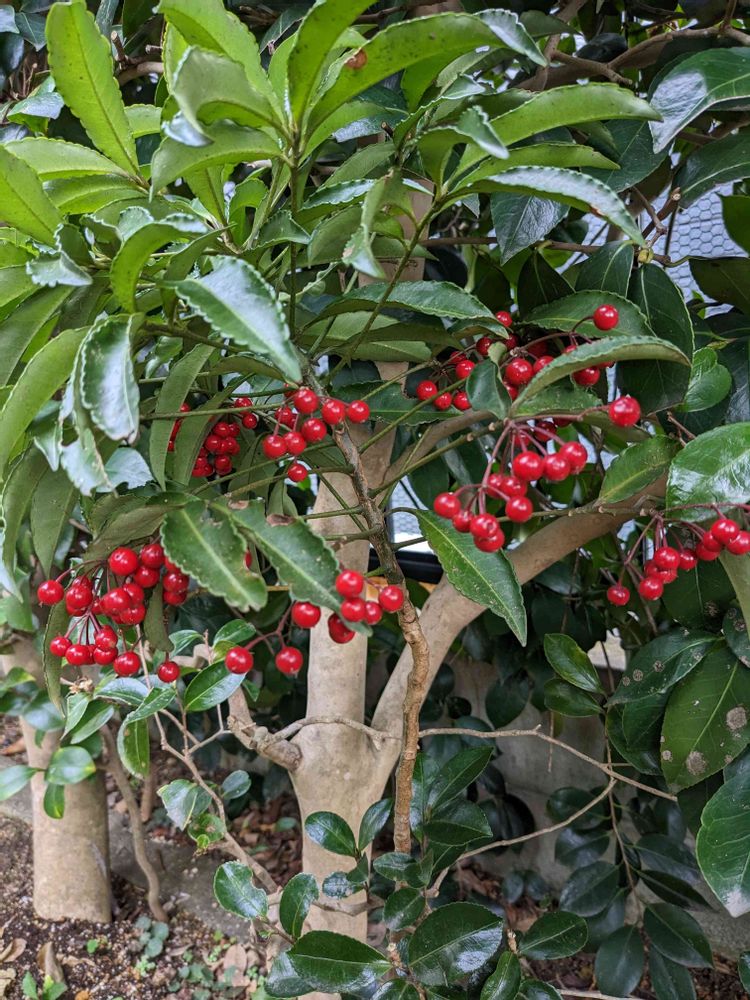椿の木の下に赤々と彩り良く映えるマンリョウ〜👏😄