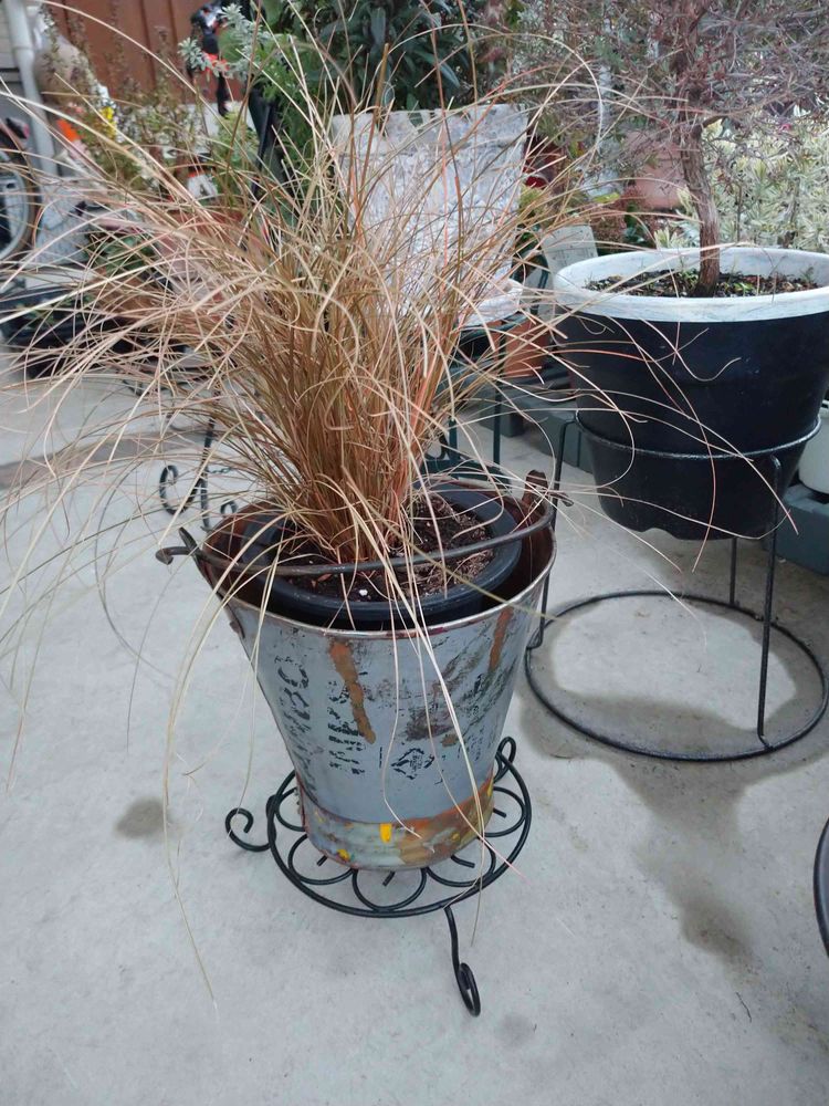枯れている様に見えるなら、更に強調しようという事で、アンティーク風のブリキのバケツに入れてみました😁