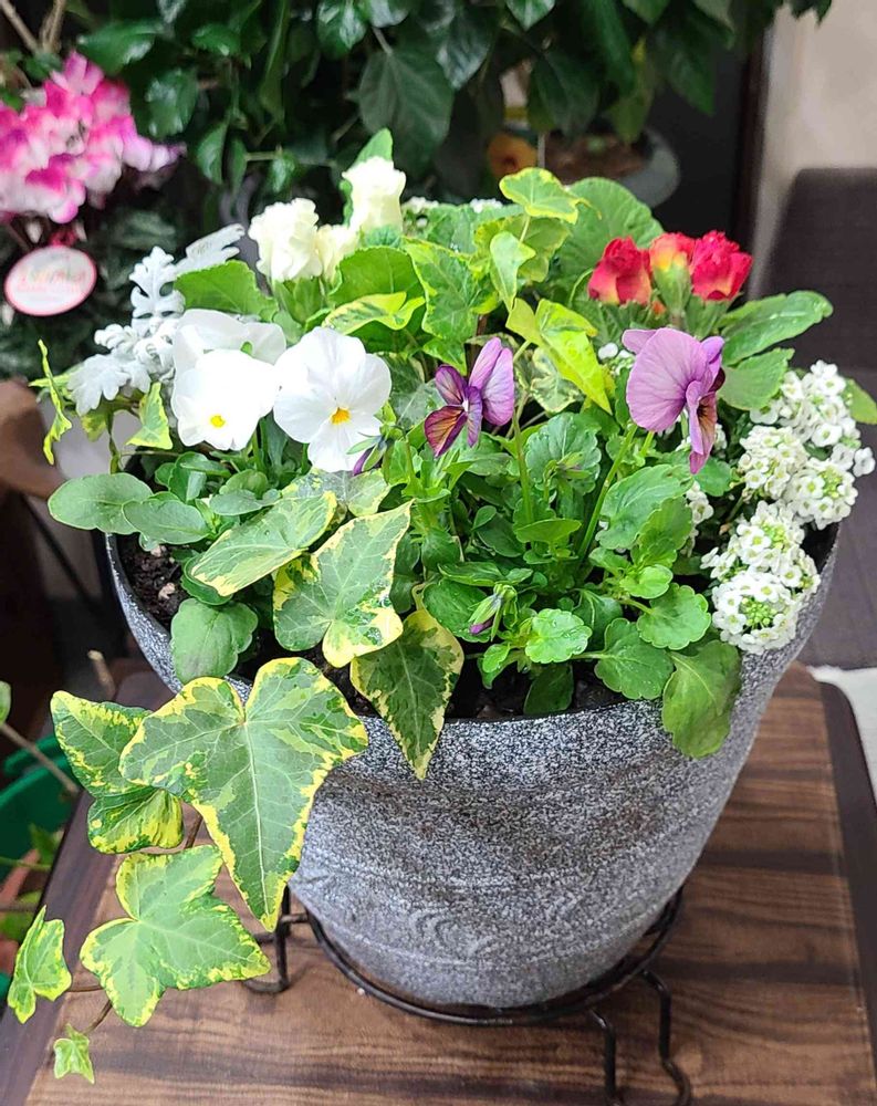 今日は、バラ咲きジュリアン赤、白と、格安ビオラ白、薄紫2苗、スイートアリッサム2苗、ヘデラとの寄せ植え作りました。