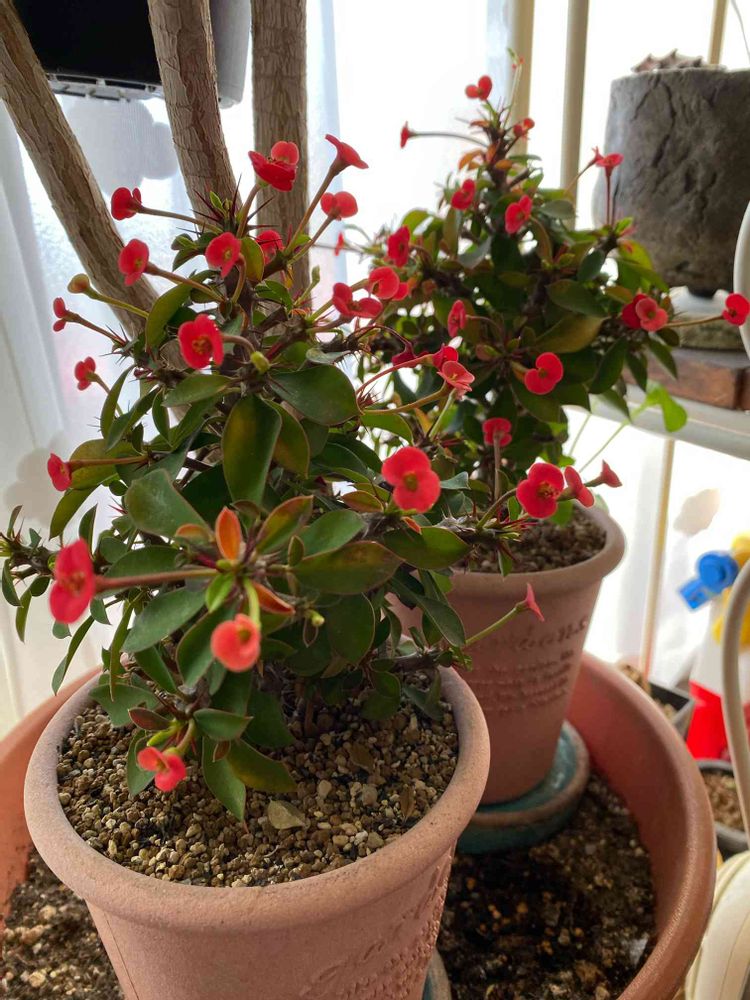 葉焼けなのか寒さなのか葉っぱの色は悪いですが新芽と🌱花はたくさんです😊