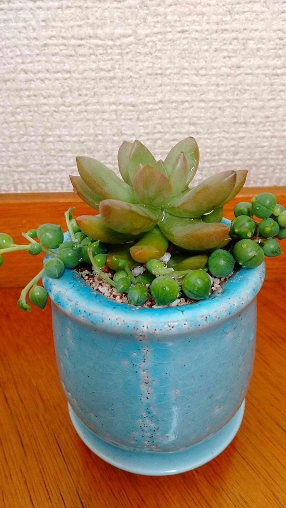 先日見つけた…ぷくぷくのオウレイを我が家のベランダでぷくぷくに育ったグリーンネックレスと一緒に植えました~🎶