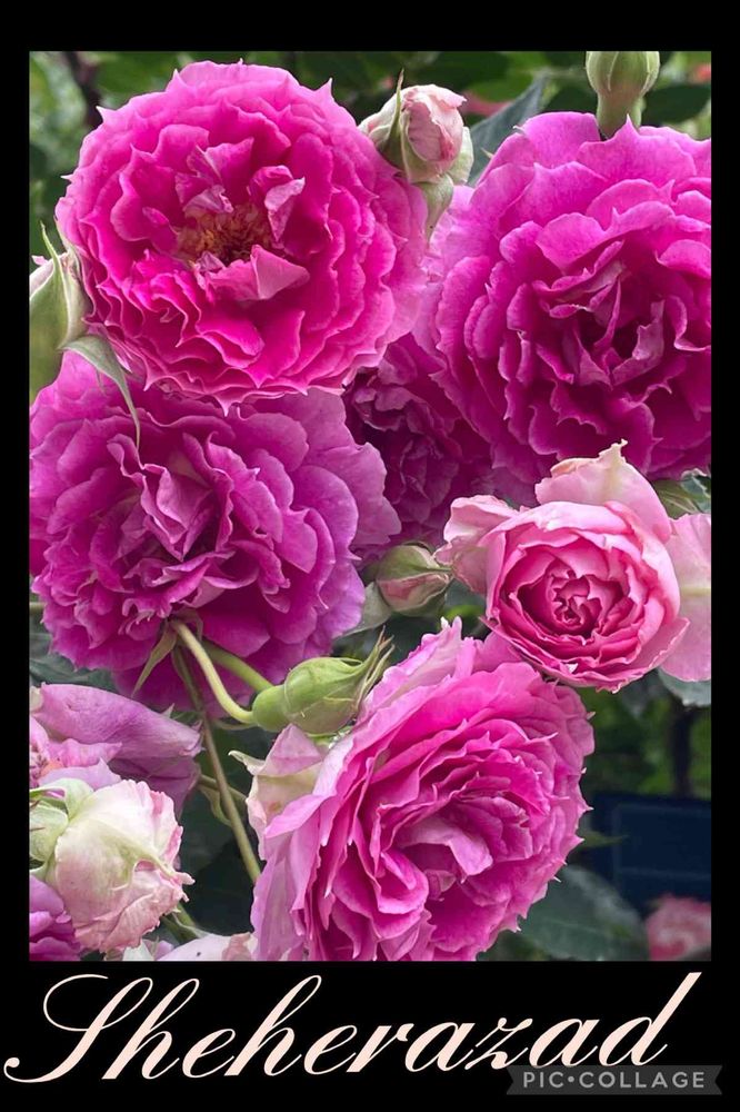 シェエラザードです💓濃いピンク色の波状弁咲き🌸ダマスクにティとスパイスの強香✨木立樹形でトゲは少なく、切り花向き。うどん粉病に強いが黒星病は普通なので月2回の適切な薬剤散布を行えば一年を通して綺麗な株姿を維持できるそう。