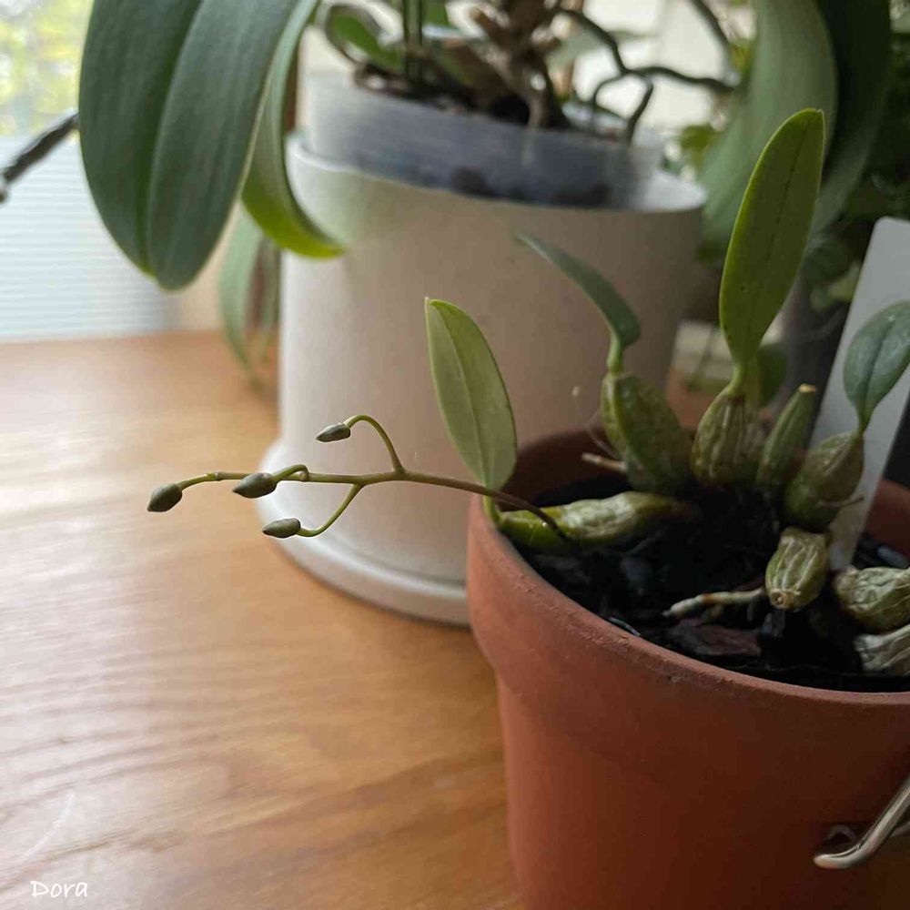 窓辺(室内)でガンガン陽に当てて、花芽が出て来たので、水やりをマメにしたら、季節を間違えたのかしら?それで、もうひとつの花芽は休んでバルブが出た⁈