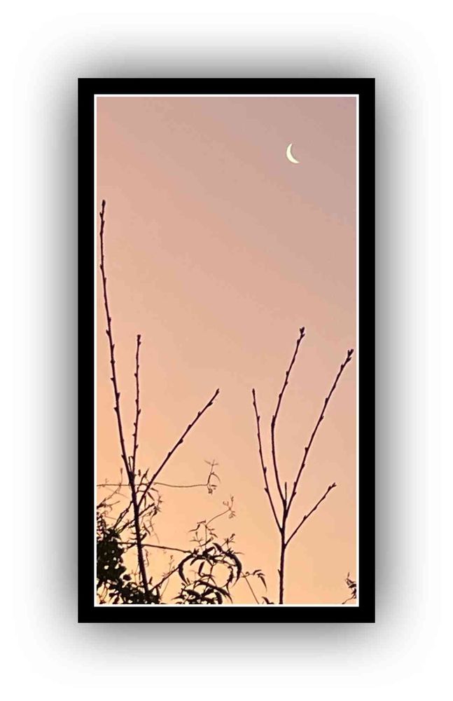 📝我が万葉の中庭に植栽している白い花桃の枝木越しに、南方の空高く遠望に観える下弦の月が白けつつしている様子をを撮ったもので、快晴の空は曙色の朝焼けに染まりはじたところデス🐶