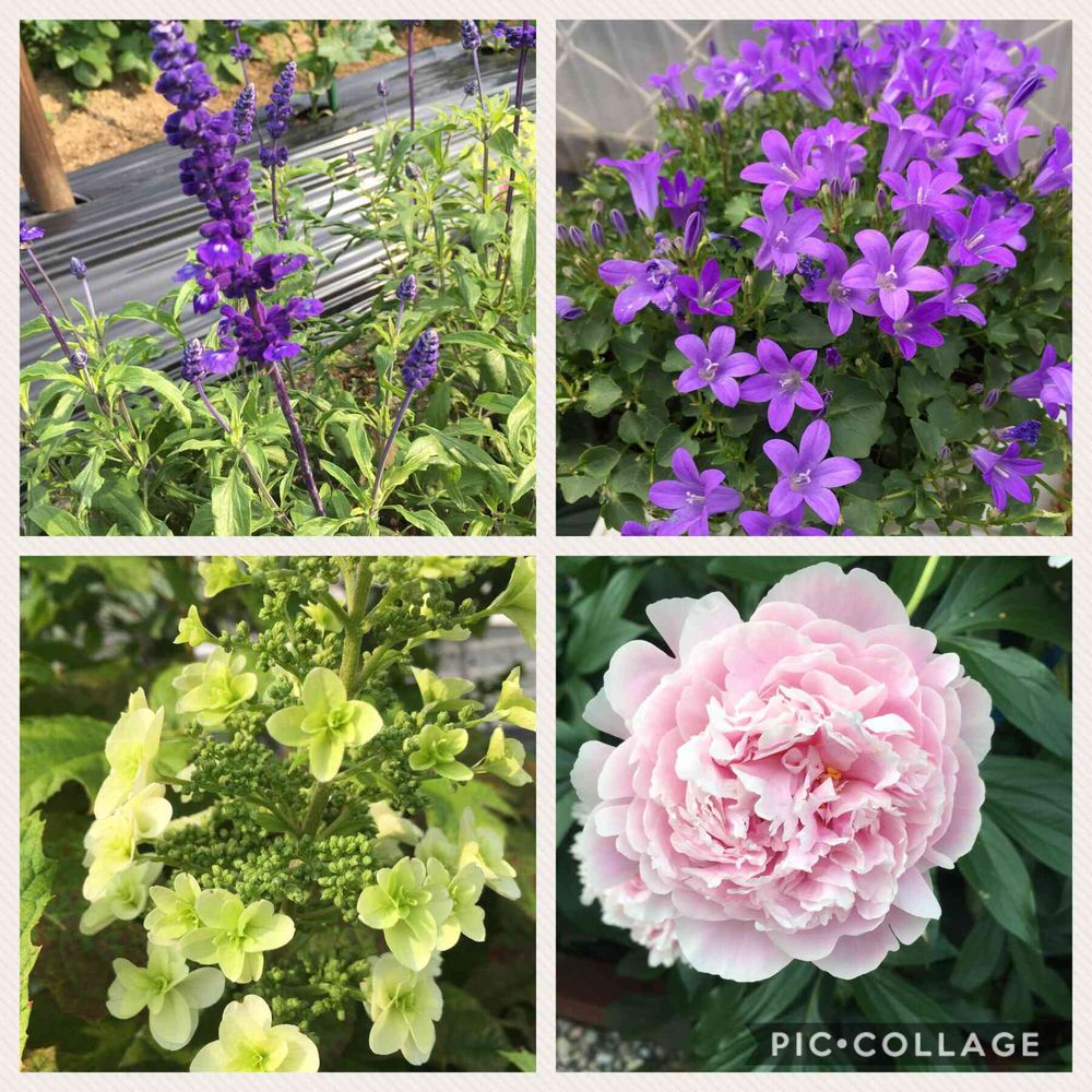 こんばんは、今日の庭1.サルビア、ベルフラワー、カシワバアジサイ、芍薬