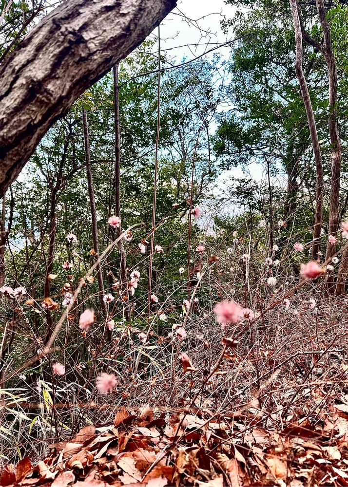 六甲連山東端の行者山東観峰の大阪平野の展望台から戻る尾根でピンクや白のコウヤボウキ(冠毛)が群生していました。