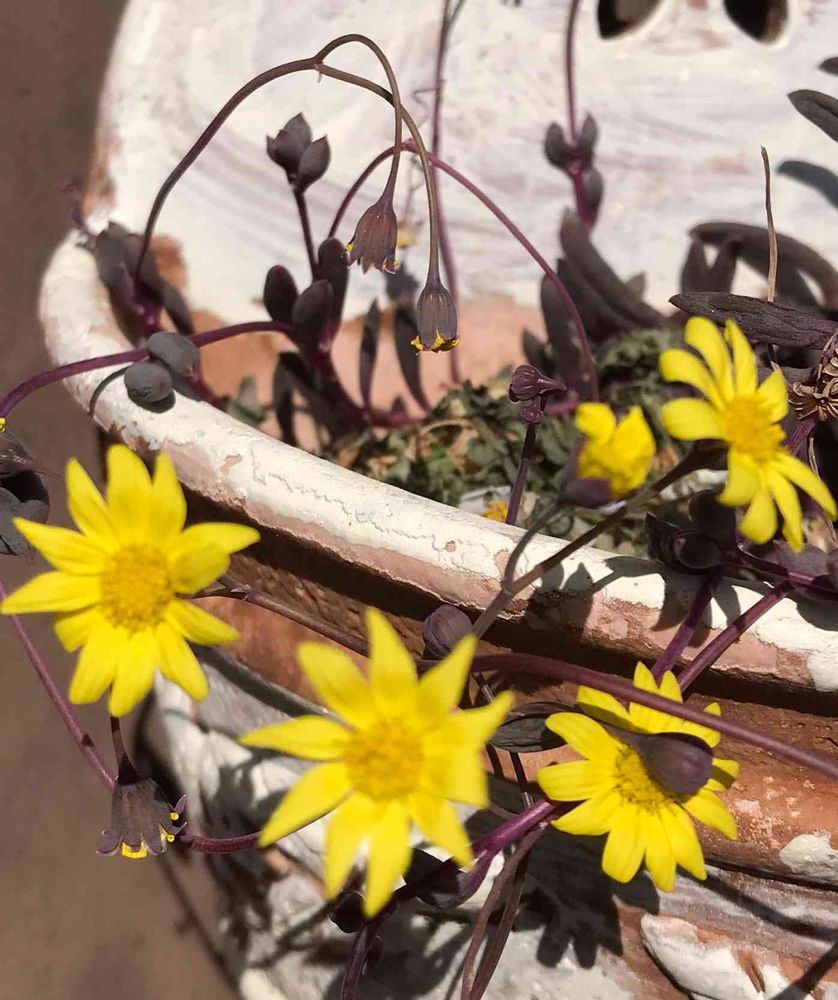 挿木で増えるので、2鉢を壁に下げて、垂れ下がる花を、毎日見ています。