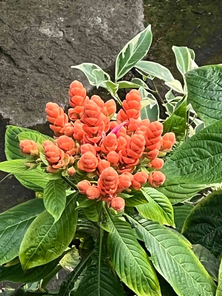 冬から春にかけて、朱色の苞にピンク色から深紅色の花を咲かせます。