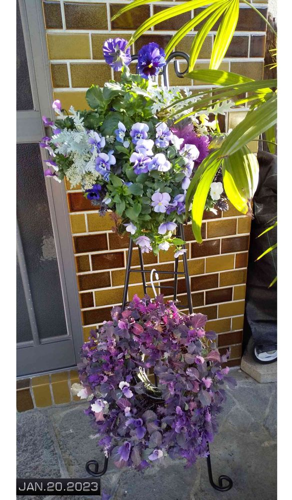 ハイスタンドが 届きました🌝早速 昨年 作っていた ハンギングバスケットとハボタンリースを飾りました😍なかなかいいね💚👍️👏✌️💚
