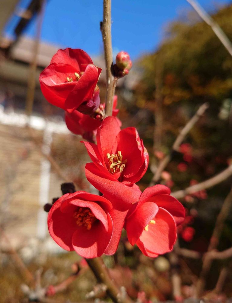 庭の木瓜が真っ赤に開き、青空の下とても綺麗でした。
