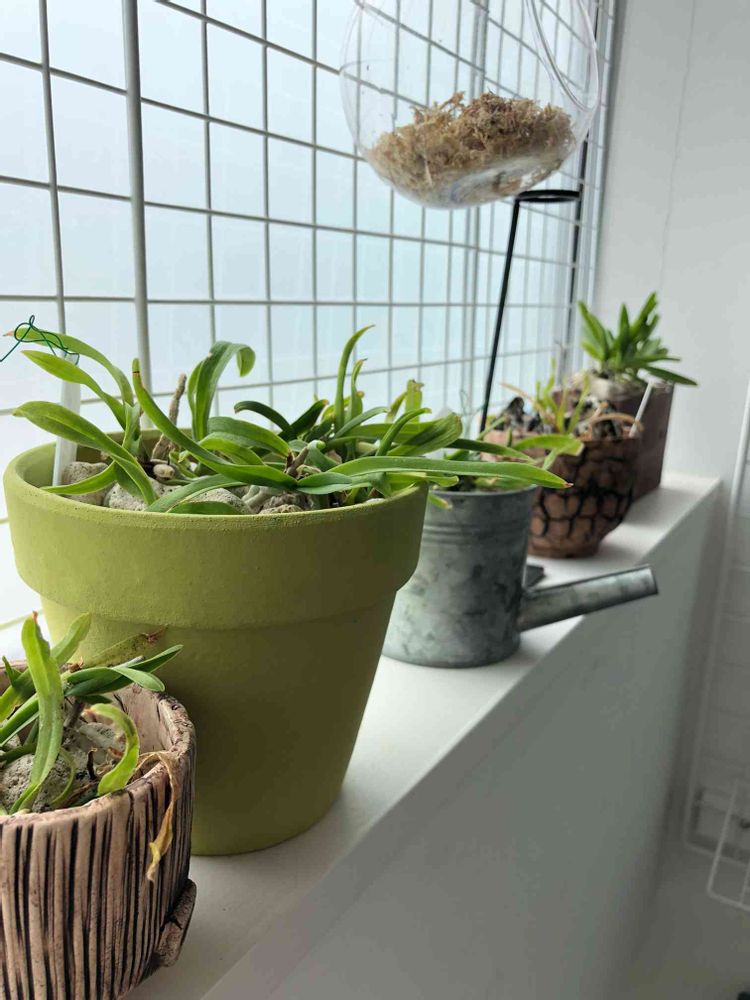 タイ🇹🇭からビン詰めで持ち帰ったものを割って中身を取り出しました。軽石を敷き詰めた植木鉢の上で、種類別に寄せて育てています。まだまだ小さいですが気根を伸ばし始め、順調に成長してくれています。花咲かせるのは10年後くらいになるそうで、子供達が社会人になる頃にはプレゼントしてあげられるかな☺️