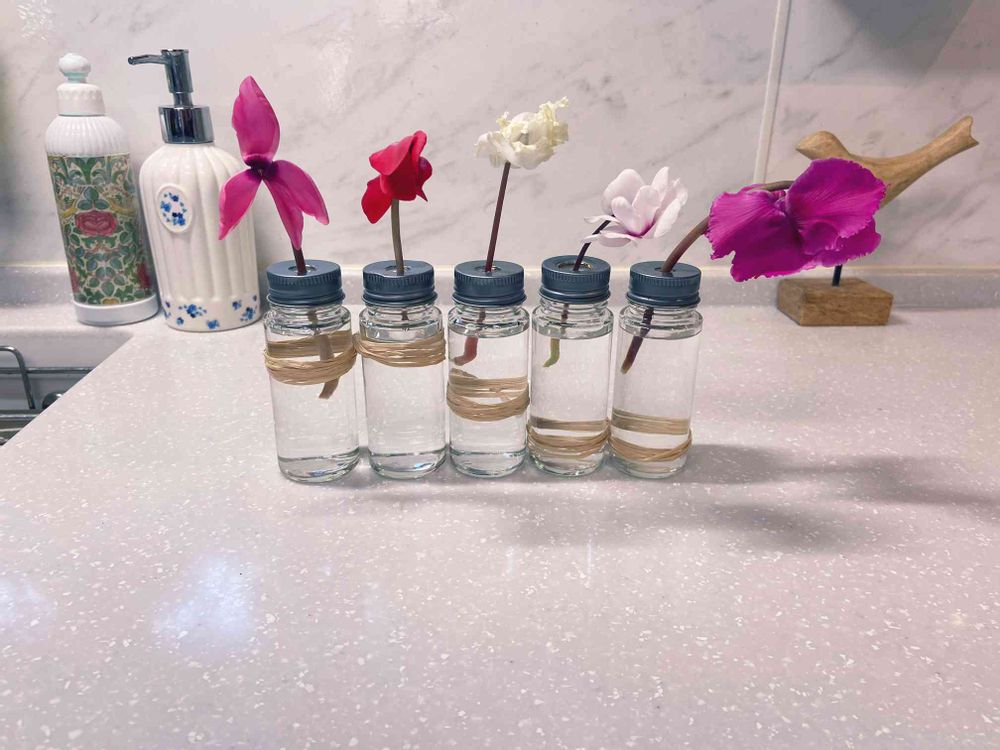 一つだけだと寂しいけど幾つか並べると一輪挿しでも賑やかで可愛いね💕