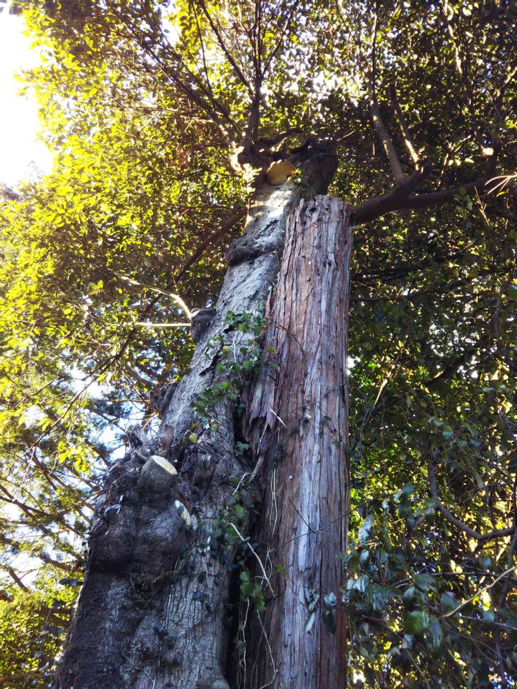 神社の木(御神木?)なんだけど、近いところで育っちゃったみたい。根元は全くの1本に見えるんだけど、見上げたら