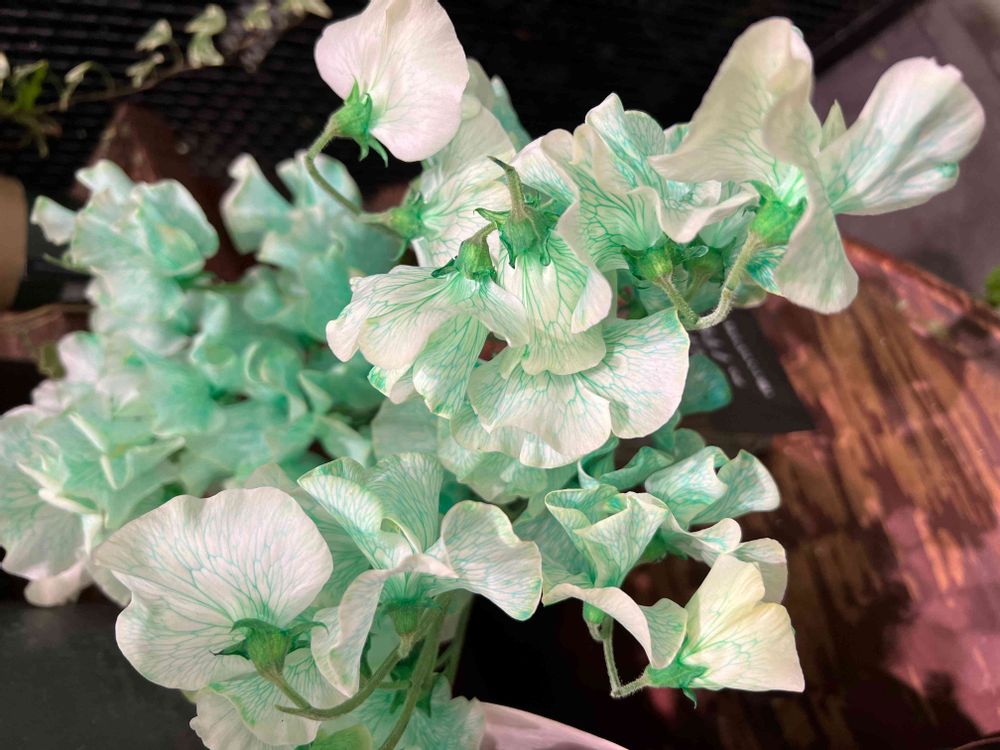 白いスイトピーに、青緑の血管が‼️面白いですね😃