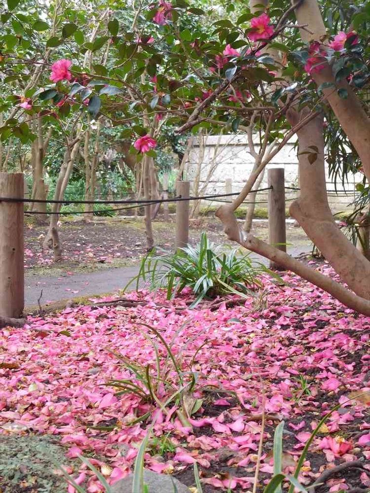 あちらこちらで、サザンカ(山茶花)の花びらが散っています。