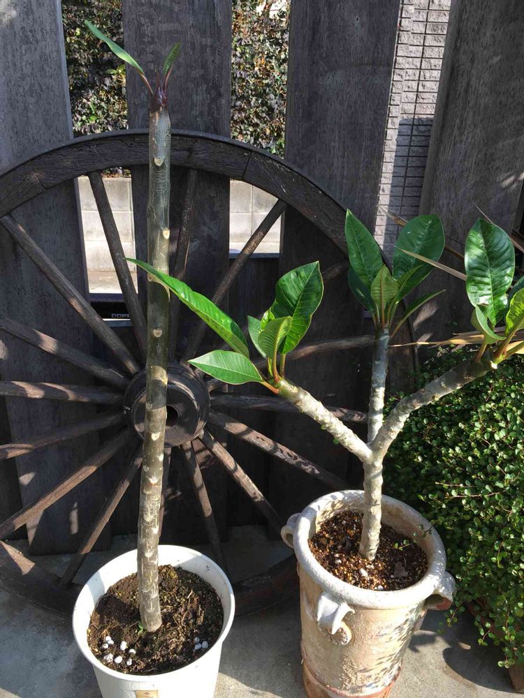 左側が先日頂いた黄色の花が咲く🌼プルメリアです。
