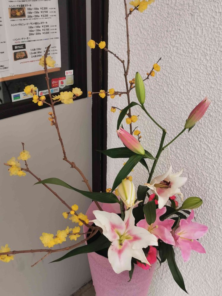 レストランの店頭(道路沿い)に花が生けてありました。🌼🌿🌷