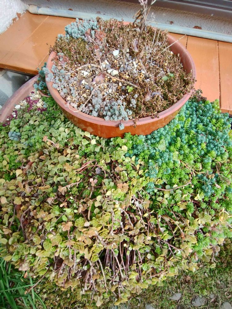 お外組、雨ざらしのセダムたちの冬すがた。