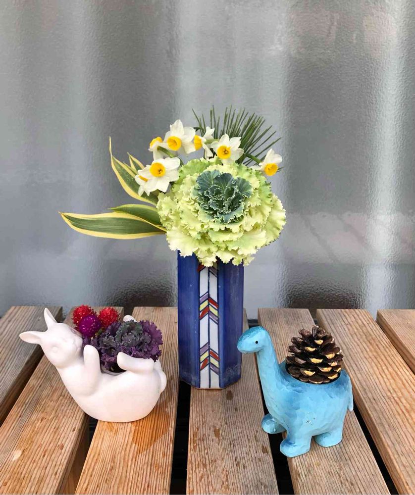 バランスとしてはスイセンの花がおおすぎますが、器のお花たちの結束を感じるので、このまま頑張ってもらいましょう👍