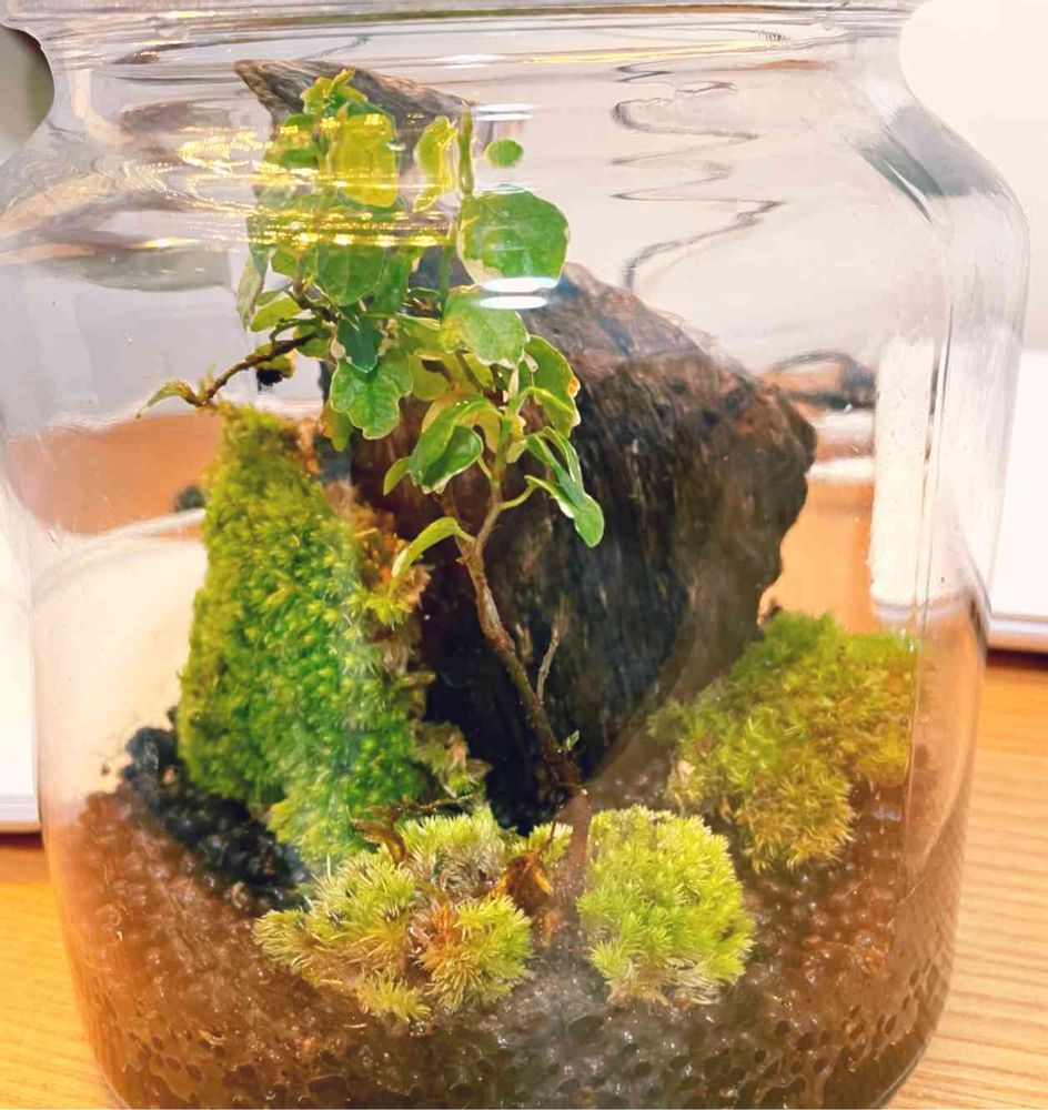 余った苔の保管場所を考えるうちに、ガラスキャニスターでしぶとくキューバパールグラス🌱発芽待ちだったのを思い出し、そっちの種入りソイルを1️⃣に拝借、2️⃣にゴッツイ流木をドカンと投入。流木の周りに水に浸した苔の塊を貼り付けるように巻き、地面に1️⃣に入りきらなかったプミラさんを植えた。根っこが見えるのを苔で隠そうと格闘したが惨敗。因みに1️⃣には皆さんの苔テラを参考にしてレインボーファンをちまちま植え付けてみた。とりあえずこれでOK☆