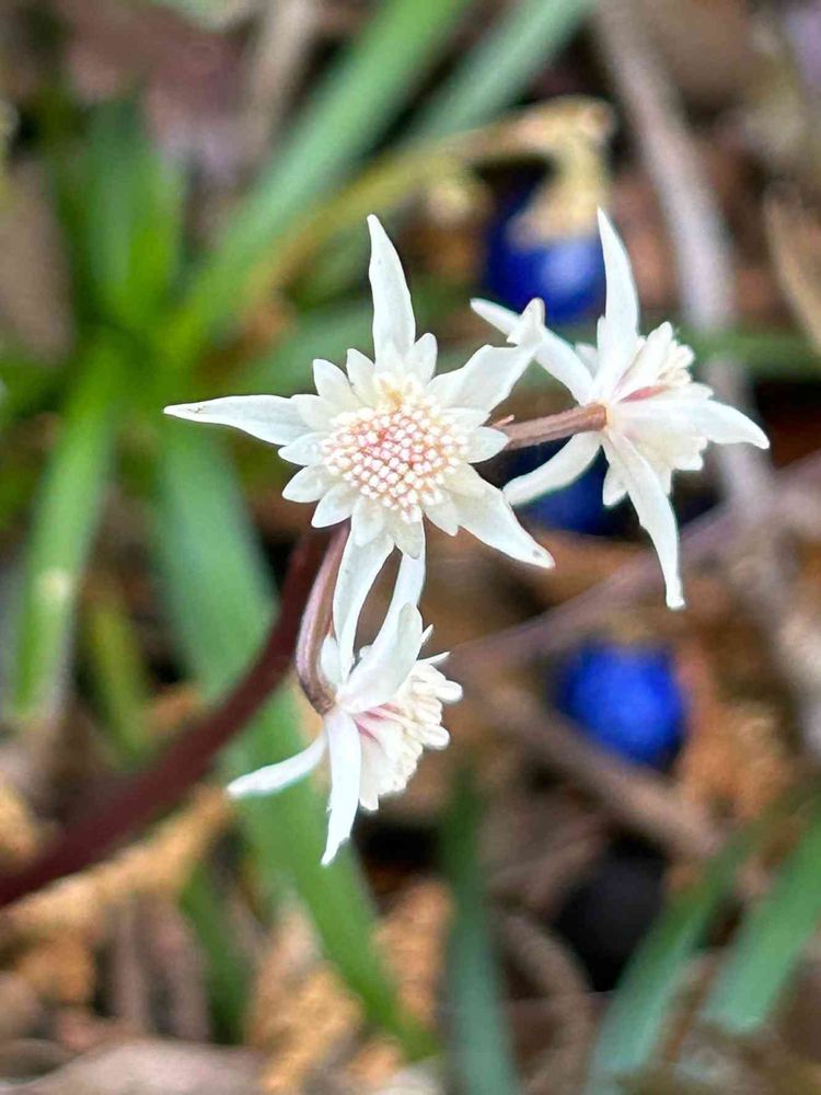 オウレン。水戸市植物公園の薬草園で毎年最初に咲く花が、このオウレンだそうです。今年ももう咲いていました。小さなお花ですが、花びらに見えるのは萼で、その萼より小さなさじ形になったものだそうです。薬としては根茎を使うようです。