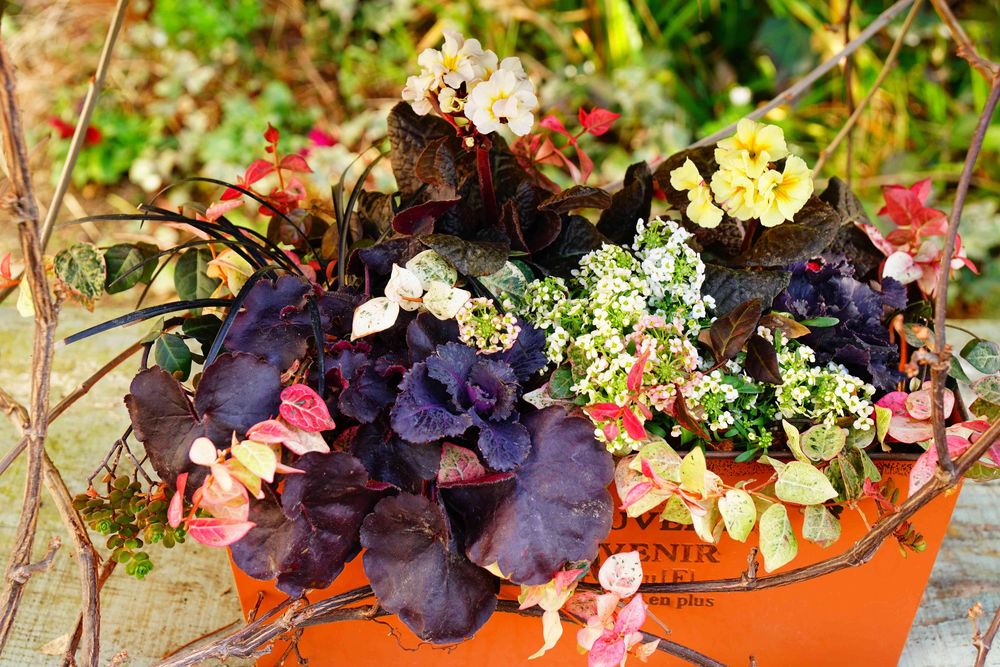 銅葉のプリムラ ジェシカを使った寄せ植え。