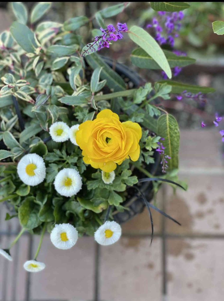 一昨年に寄せ植えに使った鉢にセイヨウイワナンテンとコクリュウがそのまま残っていましたのでそこにハーデンベルギア💜とラナンキュラス💛とデージー🤍を寄せて作りました😊