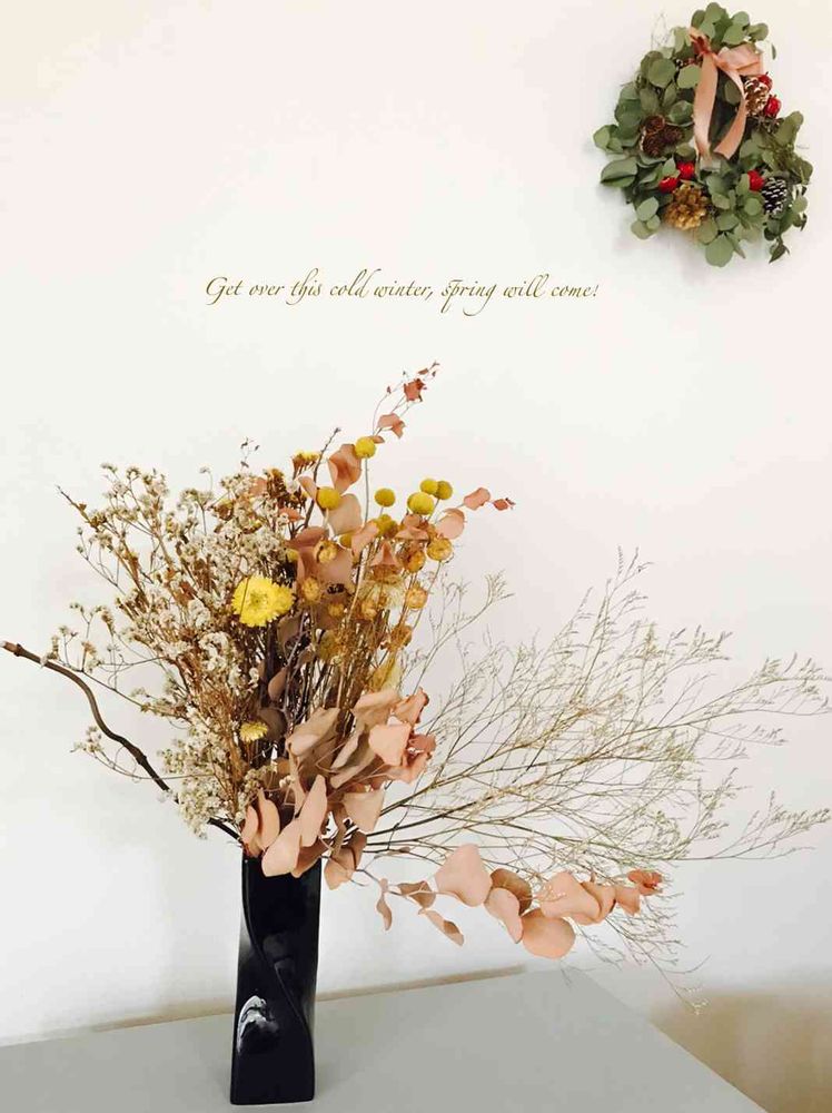 右上のリースはクリスマス前に作ったもので、鉢で育てているユーカリの葉を使っています。生の葉をリースにして部屋の中でジワジワとドライになりました。